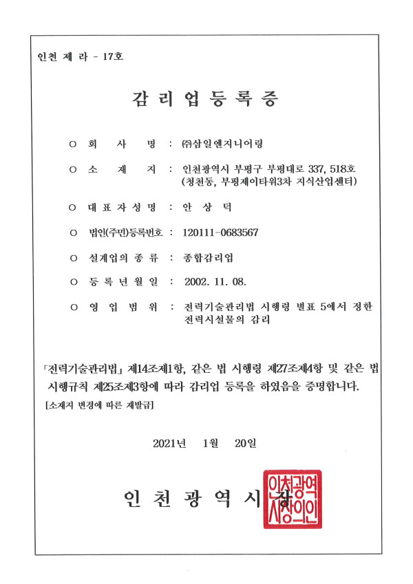 감리업등록증 페이지 정보 작성자 최고관리자 댓글 0건 조회 699회 작성일 19-03-22 13:44 본문 감리업등록증 목록 이전글사업자등록증 19.03.22 다음글설계업등록증(1종) 19.03.22